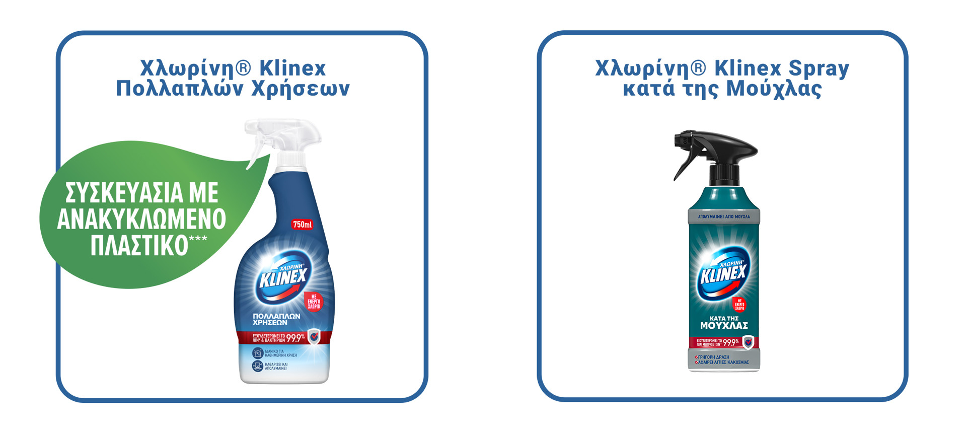 ***Ισχύει για τη Χλωρίνη Klinex Spray. Φιάλη αποτελούμενη από 50% ανακυκλωμένο πλαστικό (εξαιρούνται η ετικέτα και η αντλία ψεκασμού).